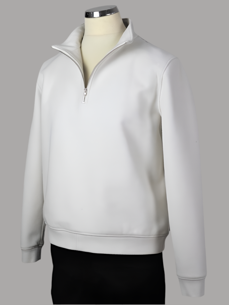 Pullover mit Stehkragen und Reißverschluss. Casual zur Jeans oder elegant zur Stoffhose kombinierbar, die Aufmerksamkeit ist garantiert. Der Pullover ist cremeweiß und das Material hat eine wunderbar strukturierte Oberflache mit angenehm weicher Viskoseinnenseite für den perfekten Tragekomfort.